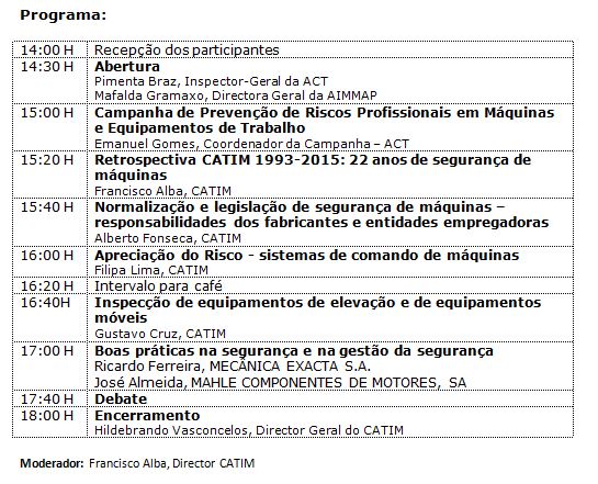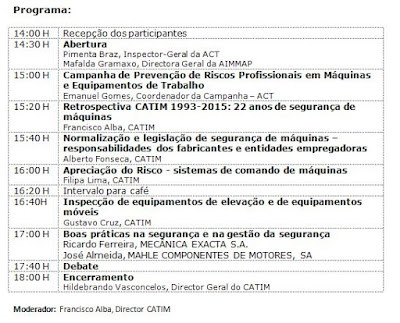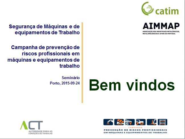 Com sala cheia (cerca de 100 participantes) e umas dezenas de pedidos de inscrição que infelizmente não puderam ser satisfeitos, decorreu no passado dia 24 o seminário "Segurança de Máquinas e de equipamentos de trabalho", evento promovido pela AIMMAP e pelo CATIM no âmbito da campanha de prevenção de riscos profissionais e equipamentos de trabalho.